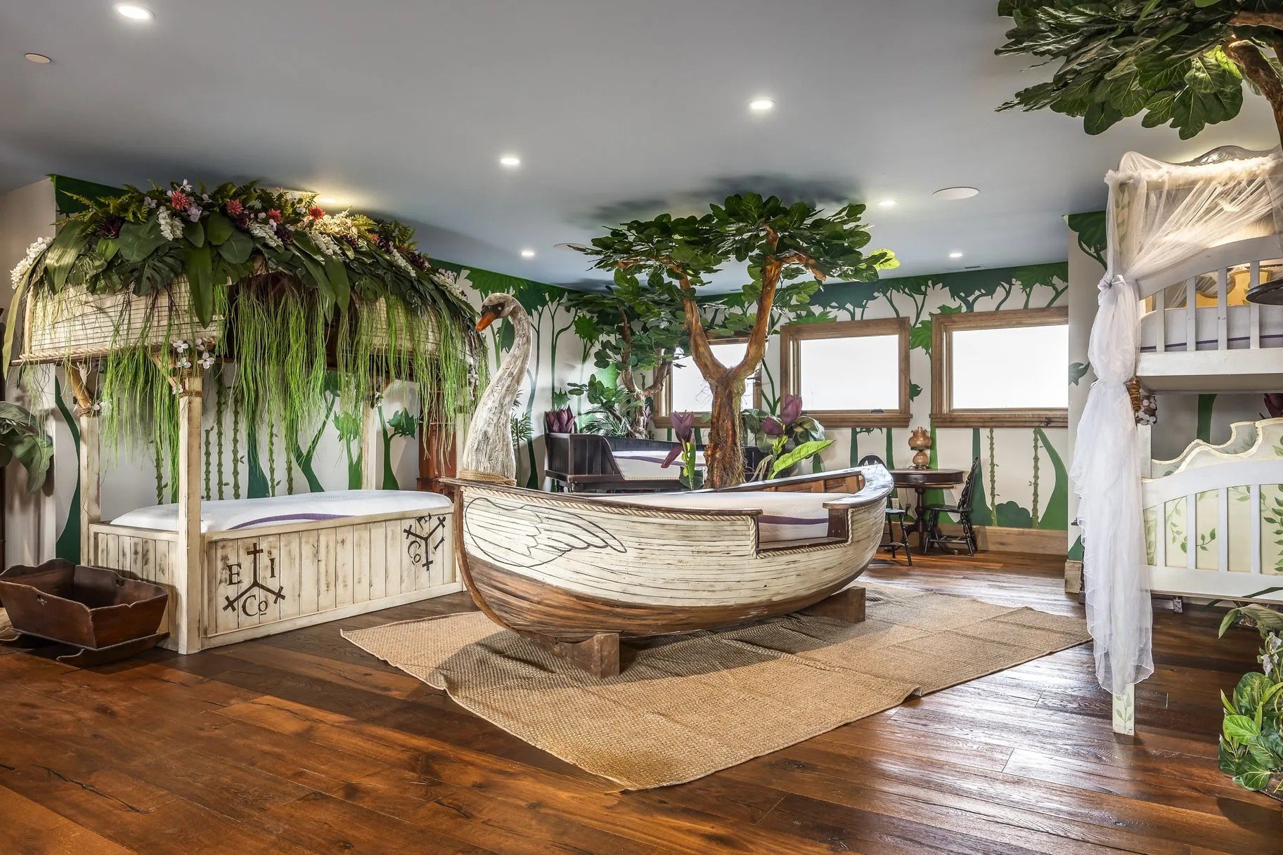 Residents and guests have unending options for entertainment—many of them with Disneyland themes. They can divert themselves in a Swiss Family Robinson–inspired bunk dorm, a Tiki Room replica, or a shooting gallery reminiscent of the one in Frontierland.