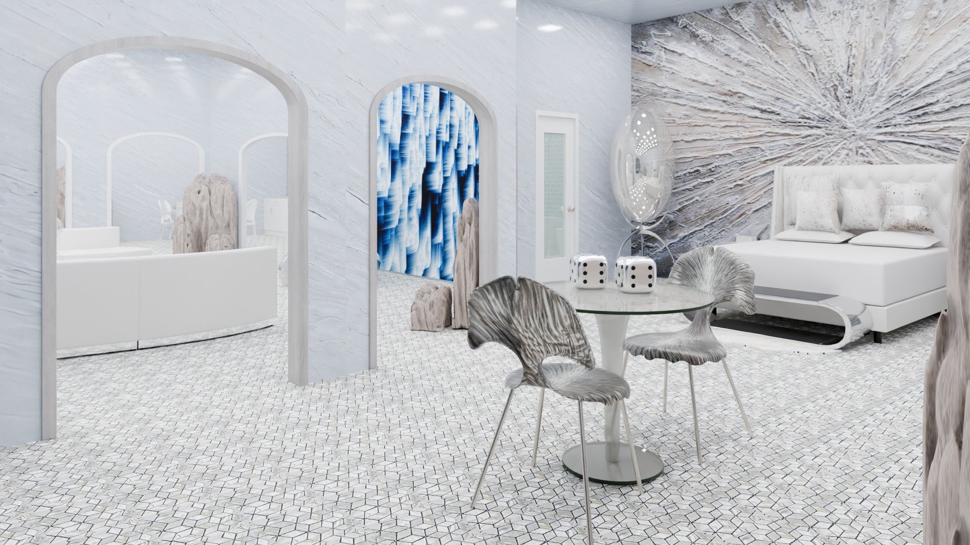 “When rummaging through the comic strips, many illustrations have one open great room and one icy grand entrance with views of the entire space. I immediately got the feel of the modern day equivalent of a loft. Masculine, open, icy, loft vibes.