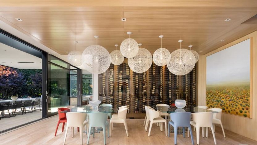 These uniquely laid-out dining rooms come in the Palisades Riviera’s “Flight House,” so named because of its butterfly roof. The 8,008-square-foot mansion features a relatively paltry three bedrooms and 3.5 baths, which means most of the rooms are enormous.